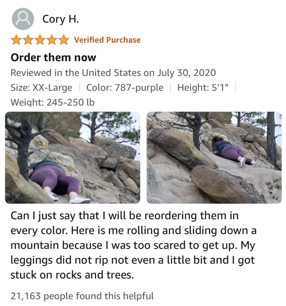 In July 2020, a woman named Cory H. posted a review on Amazon that would become legendary. She’d bought a pair of Raypose yoga leggings for $21.99. Nothing remarkable about that. What was remarkable was the photographic evidence she included: two images of herself sliding face-down on a rocky mountainside, too frightened to stand up and walk.